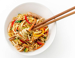 Мякоть бедра цыплёнка, цукини, лук красный, морковь, перец болгарский, масло чесночное, лапша пшенич...