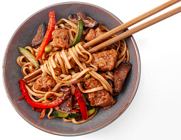 Свинина, соус хойсин, лапша пшеничная, цуккини, лук красаный, морковь, перец болгарский, бобы эдомам...