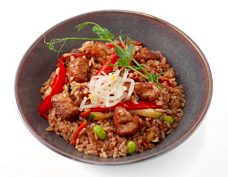 Свинина, соус хойсин, цуккини, лук красаный, морковь, перец болгарский, бобы эдамамэ, соевые ростки,...