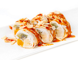 Сладкий блинчик, сладкий сыр, киви, банан, персик консервированный, топпинг карамель, лепестки минда...