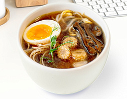 Яичная лапша, бульон Суймоно, яйцо куриное, грибы Шиитаки, мини кукуруза, соевые ростки