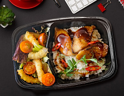 Ролл с морским окунем темпура, японским омлетом, грибами, соусом Спайси, сливочным сыром, такуаном и соус Терияки,