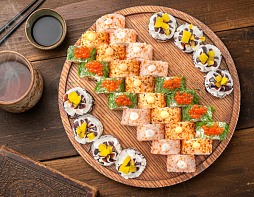 Ролл в копченом лососе с креветкой в темпуре, манго, сливочным сыром и соусом Спайси.